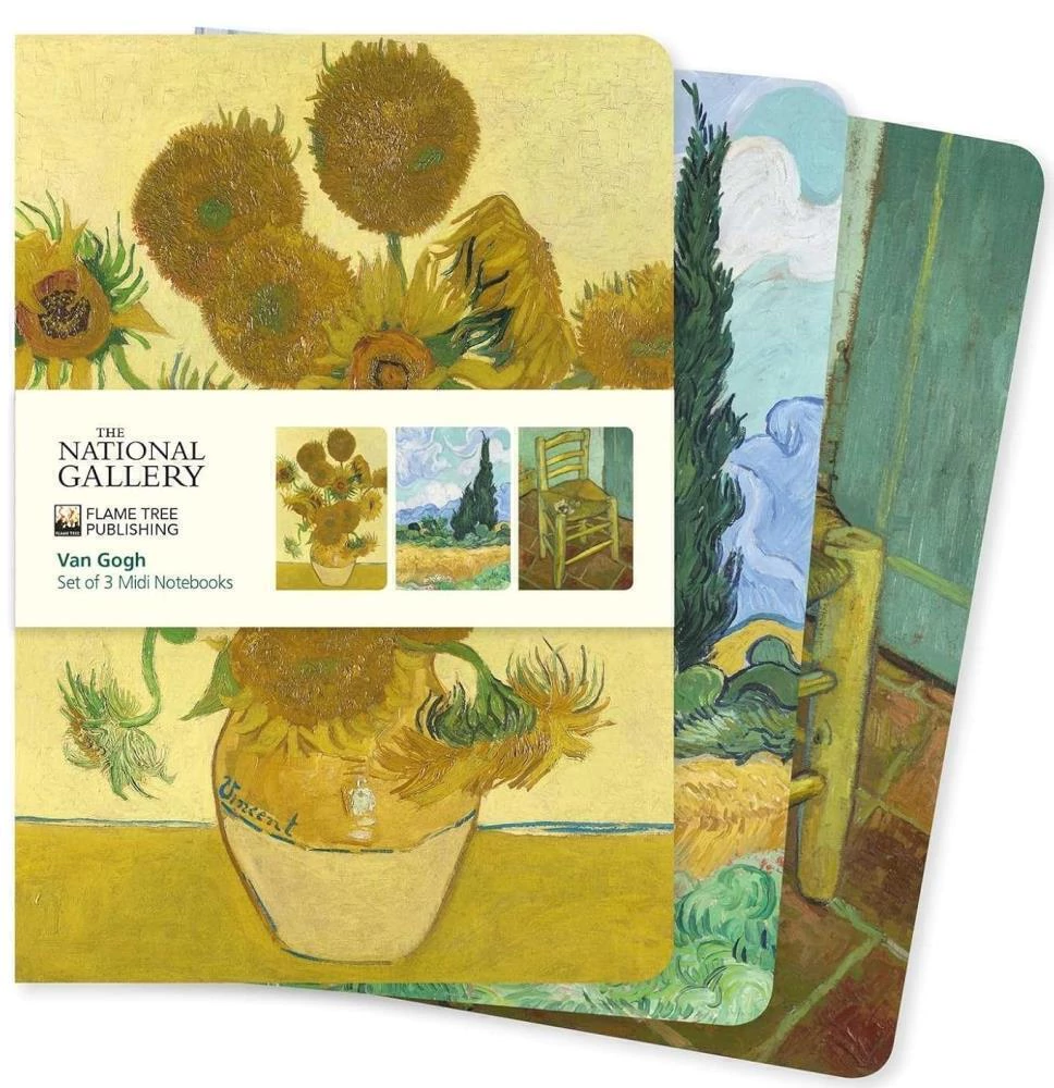 Shrink-wrapped set of 3 midi notebooks, each with a different painting by Vincent van Gogh. Stitched spine, with ruled and blank pages. High-quality production makes a stunning gift. Ideal for personal use too.