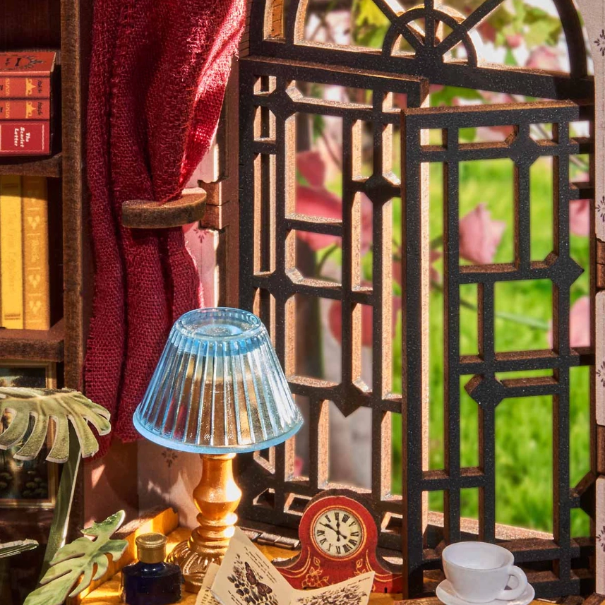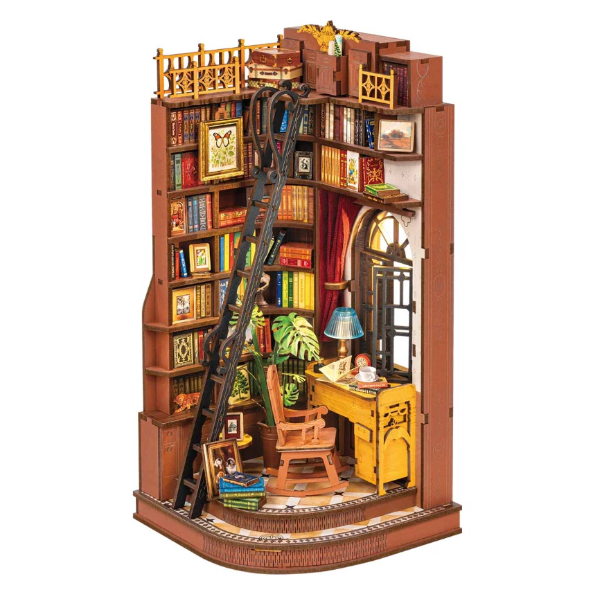 Discover the warmth of this unique place. The Rolife silent corner desk is your personal retreat, a cozy reading space that captures the magic of old-fashioned bookstores and family libraries. Immerse yourself in this little world and let yourself be carried away by creativity and freedom. With its vintage desk, charming lamp, and cup of your favorite beverage, your comfortable rocking chair is ready to welcome you for a few hours while you build this DIY shelf unit. This little corner is cleverly used, with books stacked high on each shelf. Each volume is accessible via a tall ladder, and the space is well ventilated thanks to the French window adorned with a classic red curtain. The puzzle itself is an easy and relaxing construction, further highlighting the soothing hobby that Rolife promotes.